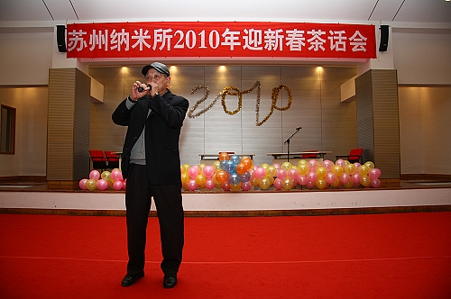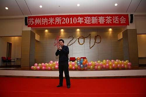 红梅报喜来,金虎迎春到。1月22日下午,苏州纳米所教育综合楼二楼多功能厅被鲜红的地毯和各色的气球装饰一新,洋溢着一派欢乐祥和的气氛。所领导杨辉、陈立桅、全所职工、学生齐聚一堂,苏州纳米所2010年迎新春茶话会在这里隆重举行。园区部分单位应邀参加了本次茶话会。