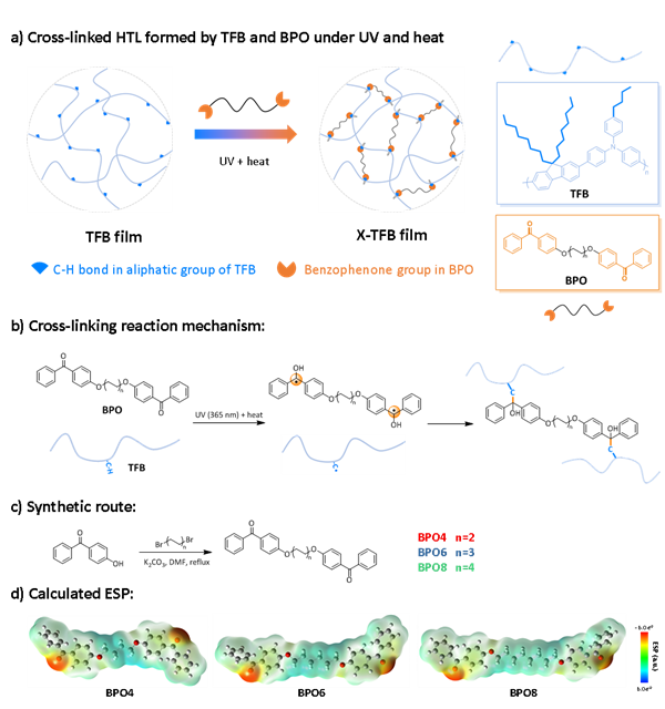 图1.(a)基于TFB与BPO的交联型抗溶剂性空穴传输层的构筑;(b)交联反应的机理;(c)BPO系列材料的合成路线与(d)分子静电势。