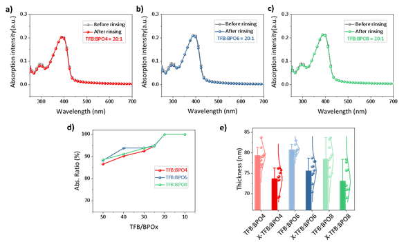 图2.(a-c)(a) TPB:BPO4, (b) TPB:BPO6, (c) TPB:BPO8在20:1交联后与氯苯溶剂清洗后的紫外-可见光吸收光谱,可以获得100%的溶剂保留,(d) 不同掺杂比例下的交联TFB:BPO薄膜使用氯苯溶剂清洗后的紫外-可见光吸收光谱(抗溶剂性) (e)交联前后薄膜的厚度变化。
