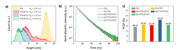 图3.(a)TFB, TPB:BPO4, TPB:BPO6, TPB:BPO8的AFM高度直方图,(b)时间分辨光致发光光谱和(c)不同薄膜的荧光量子产率。