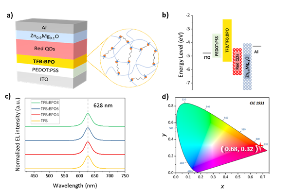 图4.(a)QLED 器件结构,(b)各功能层的能级排布, (c)基于不同空穴传输层的QLED器件的电致发光光谱EL,(d) 红光QLED的CIE 1931坐标@1000 cd m-2。
