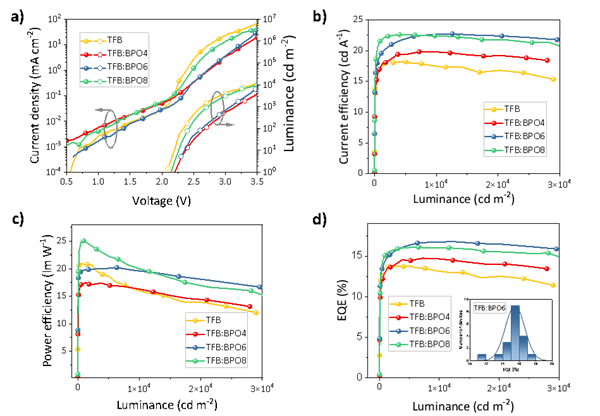 图5.(a)电流密度-电压-亮度曲线,(b)电流密度-亮度曲线,(c)功率效率-亮度曲线,(d)外量子效率-亮度曲线。
