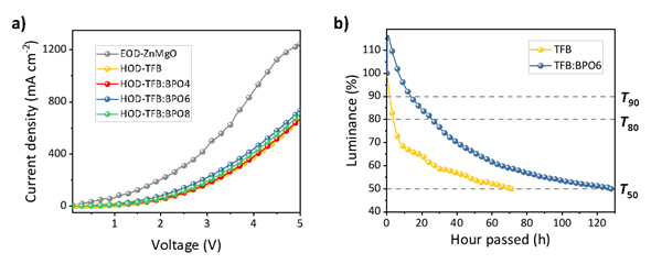 图6.(a)单电子和单空穴器件,(b)器件寿命测试结果。