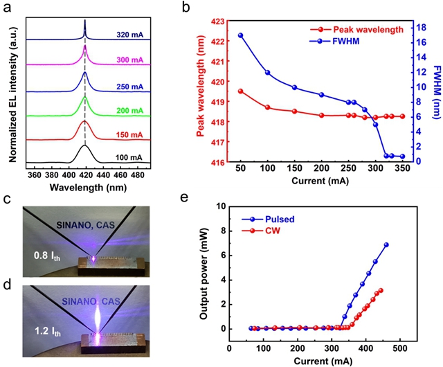 图4. 硅基GaN翻转脊形波导激光器(脊形尺寸:10×800 μm2)的(a)不同注入电流下的电致发光光谱,(b)电致发光光谱峰值波长与半高宽随注入电流的变化曲线,(c) 0.8倍和(d) 1.2倍阈值电流下的远场光斑,(e)输出功率-电流曲线。