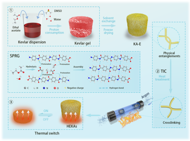 为此,苏州纳米所轻量化实验室王锦与东南大学孙正明/张培根团队合作,提出超弹"气凝胶温度开关"的概念,即气凝胶自然状态下具有优异的隔热性能,处于热传导“关”的状态;在外力大形变的作用下,热导率的增加与厚度的急剧降低,实现热传导“开”的状态。为了实现热开关的可逆“开”与“关”,另一需要解决的问题即为超弹气凝胶的构筑,同时具有极低的热导率和可靠的抗疲劳性。为此,利用缓慢质子释放策略(SPRG)结合热诱导交联(TIC)的方法制备了超轻超弹的Kevlar纳米纤维气凝胶(HEKA)并成功实现了热开关的应用(图1)。