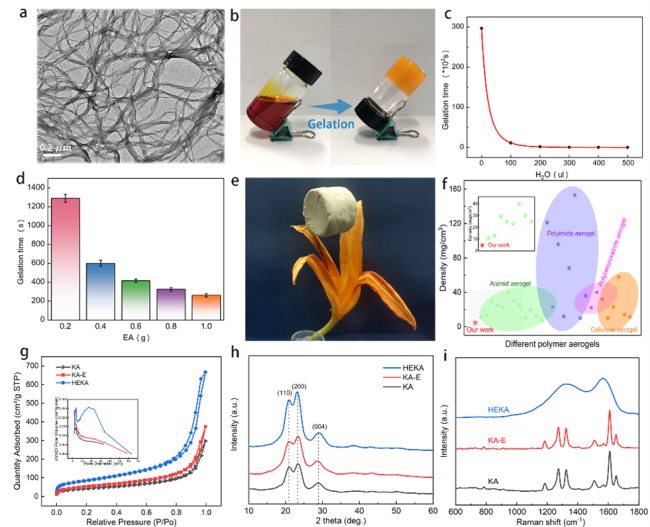 图2.(a) DMSO/KOH脱质子的Kevlar TEM图像; (b)缓慢凝胶后的凝胶图像; (c)凝胶时间与去离子水含量的关系;(d)凝胶时间与EA含量的关系;(e)站在单根花蕊上的HEKA的图像; (f) HEKA与其他类型聚合气凝胶的密度比较; (g) KA、KA- E和HEKA的氮吸附-脱附等温线(插图为其孔径);(h) x射线衍射模式; (i) KA, KA- E和HEKA的拉曼光谱
