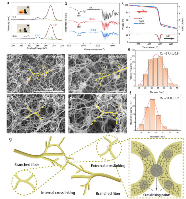图3. (a)KA-E和HEKA的C 1s区XPS谱;(b) KA的FT-IR光谱KA-E HEKA;(c) KA、KA- e和HEKA的TGA和DTA曲线;扫描电镜图像(d1)-(d2) KA-E, (d3)-(d4) HEKA;KA-E;(e) (f)纳米纤维的直径分布;(g) 提出HEKA网络结构