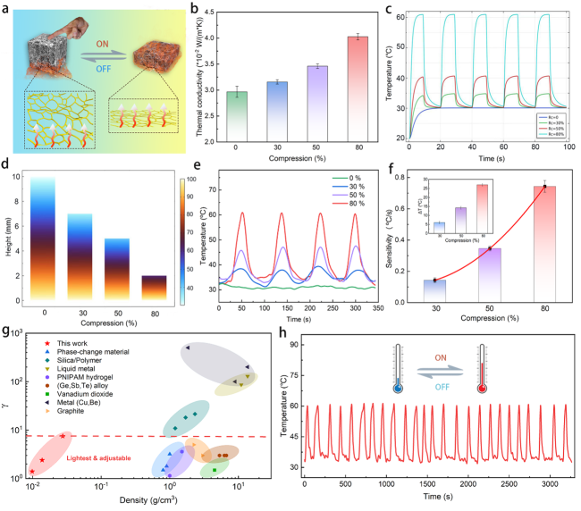 图5 (a)气凝胶热开关示意图; (b) HEKA-2不同压缩程度下的热导率;(c) HEKA-2表面模拟结果各种压应变下的温度;(d) HEKA-2温度轮廓图像模拟结果;(e)温度响应性;(f) HEKA-2在各种压缩压力的时间温度曲线图; (g) 开/关比—密度比较;(h)热开关的循环使用能力