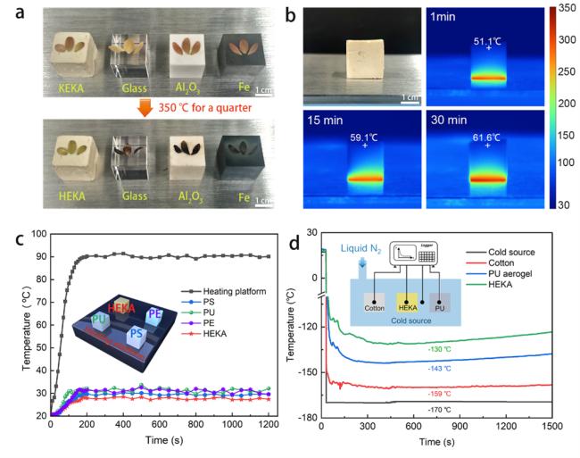 进一步验证了HEKA的隔热保温能力,HEKA上的花瓣在350℃的加热台上15min后仅发生轻微的脱水和萎焉,而在其他耐高温材料上则迅速枯萎碳化。与普通的高分子保温泡沫材料相比,其具有更优的隔热性能和更高的耐温性能,不仅如此,在超低温下的保温能力也优于棉,PU气凝胶等传统保温材料,这体现出HEKA良好的保温隔热能力(图4)。