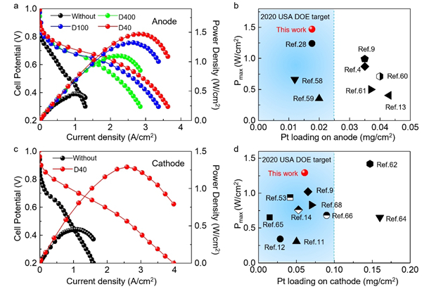 成功制备的纳米尺寸有序Nafion阵列的直径仅为40 nm(D40),密度高达2.7×1010柱/cm2,远高于文献中已经报道的Nafion阵列的密度。高密度的Nafion阵列提供了丰富的质子传递通道,有利于催化层内质子传递阻力的降低。其次,比表面积高达51.5 cm2/cm2,为催化剂的负载提供了较大的比表面积,有利于催化剂利用率的提高(图4)。进一步,纳米尺寸有序Nafion阵列的尺寸优势在燃料电池上得到了很好的证明。如图 5所示,有序Nafion阵列作为阳极一侧时,相较于尺寸更大的D400(400 nm), D100(100nm),D40峰值功率密度最高,高达1.47 W/cm2。与此同时,催化剂载量仅为17.6 μgPt/cm2。此外,D40用于阴极一侧,在61.0 μgPt /cm2的载量下,峰值功率密度可以达到1.29 W/cm2。与已经报道的文献相比,纳米尺寸有序Nafion阵列无论应用与阳极一侧还是阴极一侧,均能够在较低的催化剂载量下获得较高的峰值功率密度。此外,该工作还为电解水和电合成催化层的合理设计提供了科学的指导。
