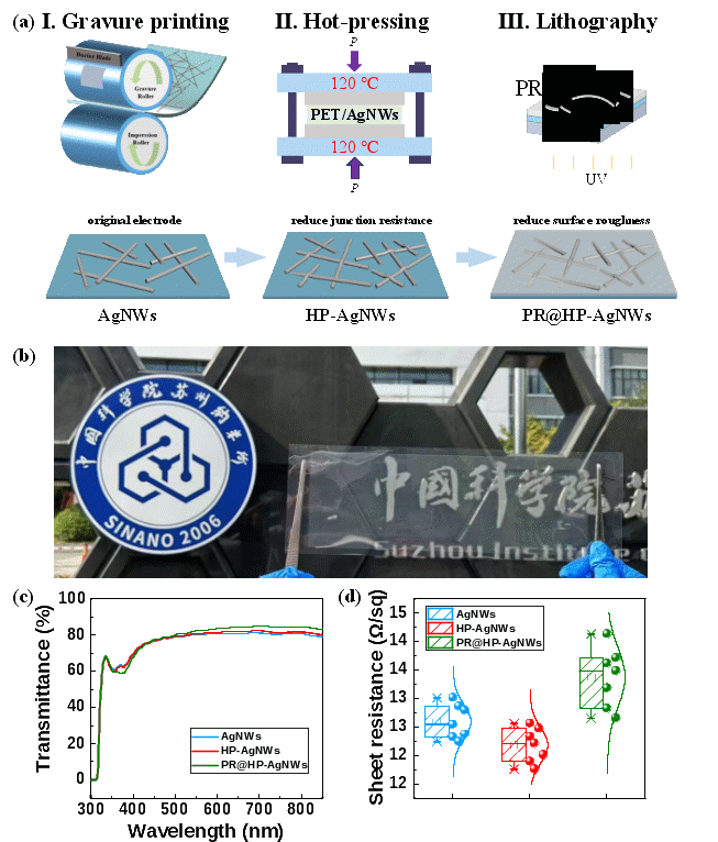 图1. 热压处理结合光敏材料选择性填充纳米网络孔洞策略提升透明导电电极光学透过率以及导电性:(a)制备示意图,(b) 电极照片,(c) 电极光学透过率,(d) 电极方阻统计