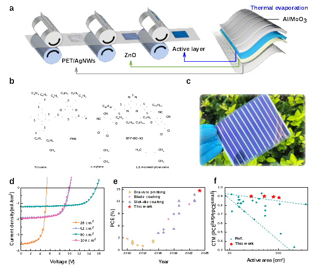 图2. 卷对卷凹版印刷制备大面积有机太阳能电池模组:(a) 制备示意图,(b) 材料结构式,(c) 模组照片,(d) 电池J-V曲线,(e) 卷对卷制备柔性期间效率统计,(f) 模组/单电池效率保持率统计