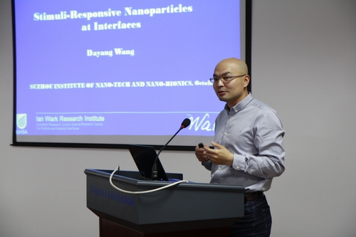 10月25日上午,南澳大利亚大学Ian Wark Research Institute 汪大洋教授来苏州纳米所进行学术交流。在A718会议室,汪大洋教授作了题为 “Stimuli-responsive Nanoparticles at Interfaces”学术报告。报告会由国际实验室靳健研究员主持,相关科研人员和学生聆听了报告。