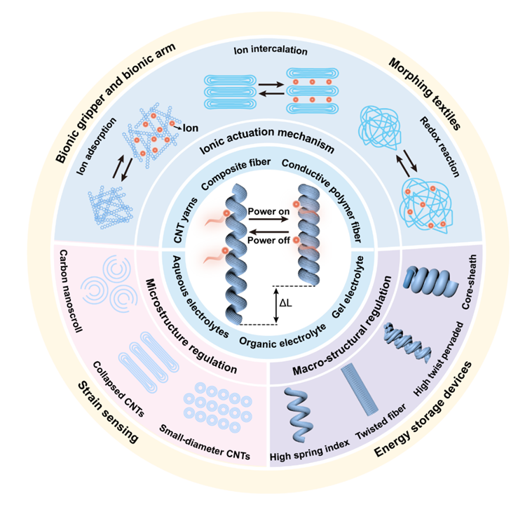人工肌肉纤维是一类可在外界刺激(如温差、电化学、溶剂、磁、光)下产生可逆形状变化的纤维材料或器件,具有结构简单、柔顺可变形、比功率密度高、易于集成、复杂变形适应性强等特点。其中,电化学人工肌肉纤维是依赖离子迁移行为实现可逆形变的智能材料体系,与生物肌肉纤维最为接近——二者不仅拥有相同的纤维状形态和收缩运动模式,还具备类似的离子溶液工作环境及离子触发驱动机制。在各类人工肌肉纤维中,电化学人工肌肉纤维因驱动电压低、无明显热效应、易于精准控制等优势备受关注,有望在植入/辅助医疗、软体机器人、智能穿戴、人机交互等领域发展中发挥重要推动作用。