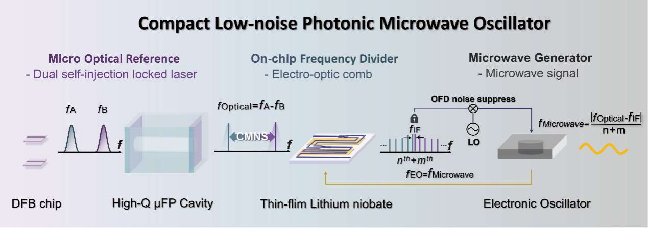图1. 基于高Q值微法布里-珀罗参考腔的紧凑型低噪声光子微波振荡器概念。主要由三部分组成:i) 微型光学参考系统。构建了一个微型微光学系统,产生具有高共模噪声抑制的双自注入锁定激光,作为频率稳定的微型光学参考;ii) 片上频率分频器。高性能薄膜铌酸锂级联调制器产生电光频率梳。在最近的两对频率梳上产生携带放大相位噪声信息的新中频信号;iii) 微波发生器。可调电子振荡器产生用于驱动调制器的微波信号。由中频信号和本地振荡信号产生的误差信号通过伺服控制反馈到振荡器,形成微波振荡环路,产生低噪声微波信号。