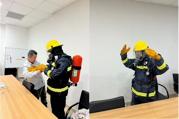 培训采取理论与实操相结合的方式展开。在理论讲解环节,专业讲师系统介绍了空气呼吸器的结构原理与使用规范,重点拆解了“查压力、听哨音、戴面罩、测气密、背气瓶”的操作流程,并对消防服的穿戴顺序、密封要点及“他救与自救”等注意事项进行了详细解析与现场演示。